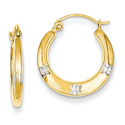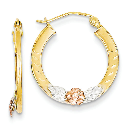 14K Gold Yellow & Rose Gold w- Rhodium Diamond Cut Flower Hoop Earrings